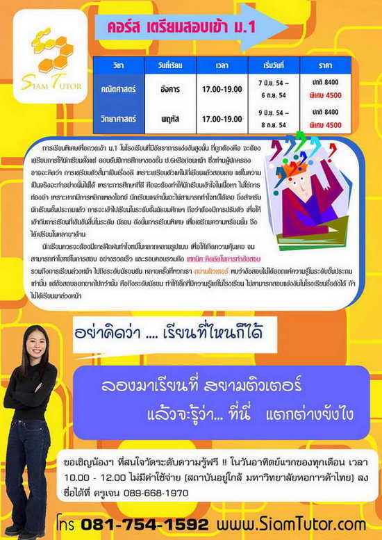 สนใจติดต่อหาพี่ๆ Siam Tutor ตอนนี้ เพราะการศึกษาไม่ใช่เรื่องล้อเล่น จะไปเสี่ยงกับครูสมัครเล่นทำไมจ๊ะ “Siam Tutor the expertise in Math and Science” ดูผลงานได้ที่ http://www.facebook.com/topic.php?uid=123121807081&topic=15123