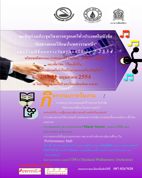 สมาคมครูดนตรี (ประเทศไทย) ร่วมกับ วิทยาลัยดุริยางคศิลป์ มหาวิทยาลัยมหิดล และ กระทรวงศึกษาธิการ ขอเชิญร่วมงานการประชุมวิชาการดนตรีระดับชาติ ในหัวข้อ “ทิศทางดนตรีศึกษาในทศวรรษหน้า” และ พิธีมอบรางวัลครูดนตรีดีเด่น ปี 2554 และร่วมชมผลงานวิจัย ด้านดนตรี และ ชมการแสดงดนตรี จากเหล่า ครู นักเรียน ศิลปินอิสระ ในรูปแบบใหม่ Music Street ครั้งแรกในไทย และการแสดงดนตรีเต็มรูปแบบ ใน Performance Hall ในวันที่ 20-21 พฤษภาคม 2554 นี้ ณ วิทยาลัยดุริยางคศิลป์ มหาวิทยาลัย มหิดล ศาลายา