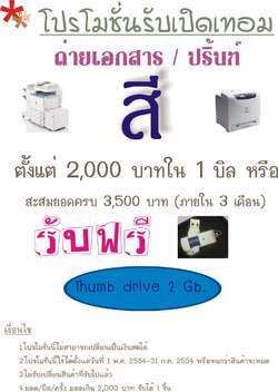 Promotion ถ่ายเอกสาร Print สี กับเราวันนี้ ยอดบิลตั้งแต่ 2,000 บาท ขึ้นไป รับฟรี Flash drive 2 Gb. หรือสะสมยอดครบ 3,500 บาท ภายใน 3 เดือน (1 พ.ค. 54 – 31 ก.ค. 54) สามารถได้รับสิทธิเช่นกัน
