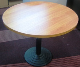 โรงงานผลิตเฟอร์นิเจอร์สำนักงานไม้เมลามีน หน้าโต๊ะกลมไม้เมลามีน เส้นผ่าศูนย์กลาง 75 - 120 ซม. ขาเหล็กหล่อสีดำพับเก็บไม่ได้ ป้องกันแรงกดทับได้ดี..ออกงานเมืองทอง 14-22 พ.ค.2554 HALL 4 ช่องทางเดิน Y