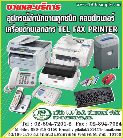 ขายและบริการอุปกรณ์สำนักงาทุกชนิด คอมพิวเตอร์ เครื่องถ่ายเอกสาร TEL FAX PRINTER สนใจติดต่อสอบถามรายละเอียดเพิ่มเติมได้ที่ บริษัท 189 ไอ.ที.ซัพพลายส์ จำกัด
