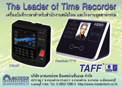 ผู้ผลิตและจำหน่ายเครื่องบันทึกเวลายี่ห้อ TAFF สนใจติดต่อสอบถามรายละเอียดเพิ่มเติมได้ที่ บริษัท มาสเตอร์เทค อินเตอร์เนชั่นแนล จำกัด