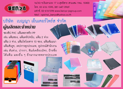 ผู้ผลิตและจำหน่าย ซองซิป PVC แฟ้มพลาสติก PP เช่น แฟ้มซอง, แฟ้มคลิปหนีบ, แฟ้ม 2 ห่วง, แฟ้ม 3 ห่วง, แฟ้มโชว์เอกสาร 10 ซอง, แฟ้มสัมมนา แฟ้มสันรูด เทปกาวทุกประเภท อุปกรณ์สำนักงาน เช่น สันห่วง ปากกา ฟิลม์เคลือบบัตร ป้ายชื่อ ไส้แฟ้ม และอื่นๆอีกมากมายหลายประเภท