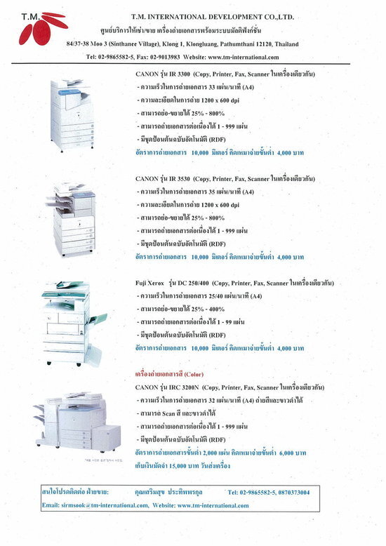 บริการเช่าเครื่องถ่ายเอกสารระบบดิจิตอลมัลติฟังก์ชั่น ประสิทธิภาพสูง ก้าวล้ำด้วยการรวมฟังก์ชั่นของเครื่องถ่ายเอกสาร (copy), พริ้นเตอร์ (printer), แฟกซ์ (FAX) และสแกนเนอร์ (scanner) ในเครื่องเดียวกันของ CANON, FUJI XEROX และอื่นๆ ตามความต้องการของลูกค้า ด้วยราคาในการเช่าประหยัดสุด