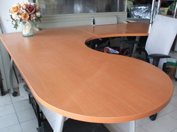 โต๊ะทำงานนำเข้า ขาเหล็ก หน้าโต๊ะสีไม้ มีล้อเคลื่อนย้ายสะดวก รูปตัว L มีจำนวนจำกัด