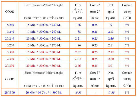 และฟิล์มยืด 15 ไมครอน กว้าง 50 ซม. ยาว 300 เมตรก่อนใช้ชั่งน้ำหนัก พอใช้หมดเหลือแกน ชั่งน้ำหนัก จะเป็นน้ำหนักสุทธิ 2.07 กก.หากน้อยกว่านี้ แสดงว่า ความยาวไม่ถึงหรือไม่คุ้มกับเงินที่จ่ายไป