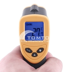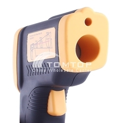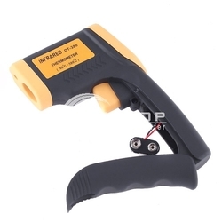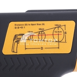 ครื่องวัดอุณหภูมิระบบเลเซอร์อินฟาเรดที่มีขนาดกระทัดรัดและใช้งานง่าย เพียงชี้ไปที่เป้าหมายแล้วกดปุ่มก็จะสามารถอ่านค่าอุณหภูมิได้อย่างแม่นยำภายในเวลาไม่ถึง1วินาที เหมาสำหรับวัดอุณหภูมิพื้นผิวในงานอุตสาหกรรม Specifications: Unit of temperature: ºC or ºF Display: 3 1/2 digit LCD display Temperature Range: -50~+380℃(-58~+716°F) Accuracy: ±2℃ Diode Laser: Output<1mW, Wavelength 630nm-670nm. Recommend measuring distance: 15cm to 1m Response Time: ≤0.8 second Emissivity: 0.95 fixed Distance Spot Ratio: 8:1 Working temperature: 0~50℃ Storage temperature: -20℃~+50℃ Working temperature: 10~40℃ Data hold funtion. Auto power off after 15 seconds if meter have no reaction. Low battery indication Certificate RoHS,CE Power supply: 1 x 9V battery (battery not included) Color: black&yellow Dimensions: 150x80x35mm
