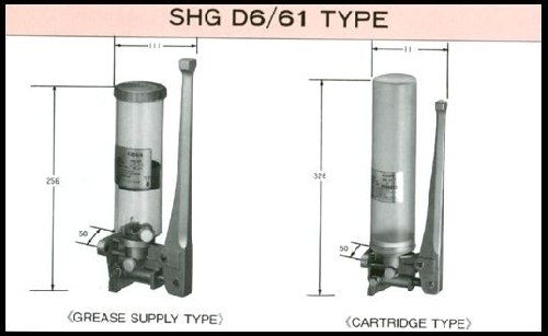 SHG เป็นปั๊มอัดจารบีด้วยมือ ออกแบบให้ใช้กับcontrol unit เช่น SG2 และ SG6 ตัวปั๊มแบ่งออก เป็น 2 รุ่นตามปริมาตรของจารบีที่ฉีดออกมา คือ 0.6 cc( SHGD6/61) และ1.0 cc (SHGD12/12-1) การทำงานของปั๊มทำได้โดย การดึงคันโยก ซึ่งจะทำให้จารบีฉีดเข้าสู่ระบบจำนวนหนึ่ง อุปกรณ์นี้ ออกแบบให้รองรับกับงานหนักได้