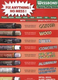 Epoxy Puttyใช้อุดซ่อมรอยรั่วรอยร้าวฉุกเฉินสามารถยึดเกาะกับพื้นผิวทุกประเภทเช่นพลาสติกคอนกรีตไฟเบอร์กลาสเซรามิคPVCอลูมิเนียมงานโลหะและเหล็กทุกชนิด