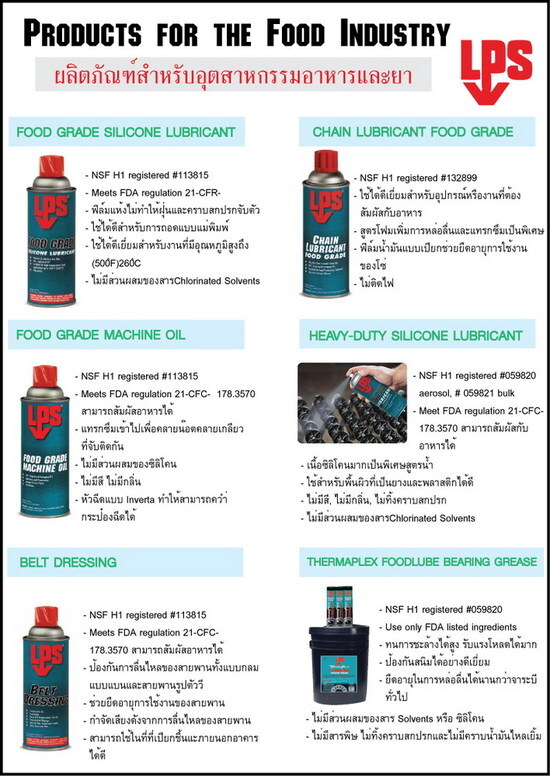 สารหล่อลื่นสำหรับอุตสาหกรรมอาหาร ลดการสึกหรอ และลดการเสียดสี ใช้ได้กับงานทุกประเภทปลอดภัยกับทุกพื้นผิว เครื่องจักร เครื่องมือ และ อุปกรณ์ต่าง ๆ