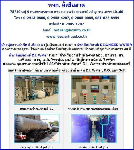 ขายน้ำกลั่น หจก.ลี้เซียฮวด โทร. 0-2413-0800 โรงงานน้ำกลั่น ผู้ผลิตน้ำกลั่น และขายส่งน้ำกลั่น-ขายปลีกน้ำกลั่น D.I. Water ติดต่อซื้อน้ำกลั่นได้ที่ 0-2805-0085, 081-622-8959 ผู้ผลิตน้ำกลั่นสำหรับงานห้องทดลอง,อาหาร,ยา,เครื่องสำอาง,เคมี,เภสัช,ไวร์คัท