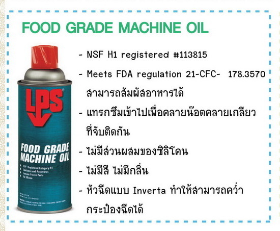 Food Grade Machine Oilสเปรย์หล่อลื่นฟู้ดเกรด สำหรับอุตสาหกรรมอาหาร ลดการสึกหรอ และลดการเสียดสี ใช้ได้กับงานทุกประเภทปลอดภัยกับทุกพื้นผิว เครื่องจักร เครื่องมือ และ อุปกรณ์ต่าง ๆ