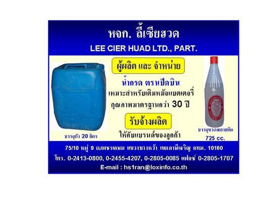 โรงงานผู้ผลิต และจำหน่ายน้ำกรดแบตเตอรี่ น้ำกรดซัลฟูริค ตราเป็ดบิน เหมาะสำหรับเติมหม้อแบตเตอรี่ คุณภาพมาตรฐานกว่า 40 ปี และรับจ้างผลิตน้ำกรดให้กับแบรนด์ของลูกค้า ติดต่อ หจก.ลี้เซียฮวด โทร. 0-2413-0800, 0-2455-4207, 0-2805-0085