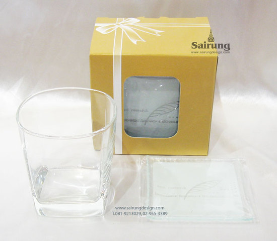 ** ในภาพเป็นแก้วเหลี่ยม ขนาดแก้ว ปากกว้าง 7.6 ซม สูง 7.9 ซม พร้อมสกรีนโลโก้ 1 สีฟรี