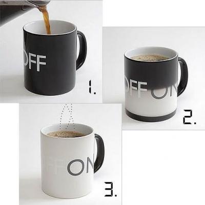 ถ้วยกาแฟ (ON/OFF) แก้วน้ำเปลี่ยนสี แก้วนี้เมื่อโดนความร้อนแก้วจะเปลี่ยนเป็นสีขาว เป็นสินค้าไอเดียเก๋มากเลยค่ะ