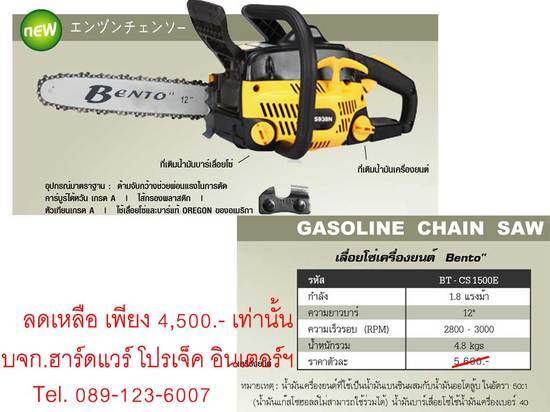 ลดราคา เลื่อยโซ่เครื่องยนต์ BENTO BT-CS1500E จากราคา 5,600฿ เหลือ 4,500฿ เเละยังมีสินค้าอีกหลายรายการที่ลดราคาเเละรอให้คุณชมอยู่
