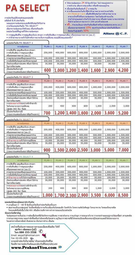 อลิอันซ์ ซี.พี.ประกันภัย ประกันอุบัติเหตุส่วนบุคคลพลัส "PA SELECT" เลือกความคุ้มครองให้ตัวคุณ เพื่อคนที่คุณรัก เริ่มต้นที่ 2 บาทต่อวัน คุ้มครองถึง 3ล้าน พร้อมค่าปลงศพ ชดเชยรายได้