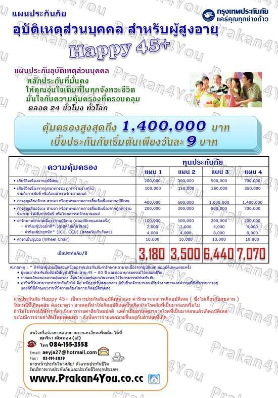 กรุงเทพประกันภัย อุบัติเหตุผู้สูงอายุ “Happy45+” ต่ออายุได้ตลอดชีพ คุ้มครองสูงสุดถึง 1,400,000 บาท ด้วยเบี้ยเพียงวันละ 9 บ ค่ารักษาพยาบาล 2 แสน บ/ครั้ง ไม่จำกัดจำนวน พร้อมรถเข็นผู้ป่วยอีก 10,000 บ #ไม่ต้องตรวจสุขภาพ#