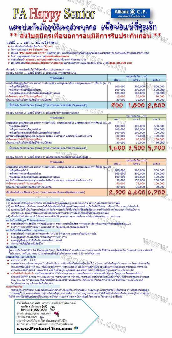 อลิอันซ์ ซี.พี.“PA Happy Senior” เพื่อพ่อแม่ที่คุณรัก คุ้มครองกรณีเสียชีวิต สูญเสียอวัยวะ ทุพพลภาพและค่ารักษาพยาบาลเนื่องจากอุบัติเหตุ ด้วยทุนประกันภัยสูงสุดถึงห้าแสนบาท พิเศษ! ด้วยความคุ้มครองกรณีกระดูกแตกหัก ไฟไหม้ น้ำร้อนลวก เงินทดแทนเพิ่มเติมกรณีเสียชีวิต