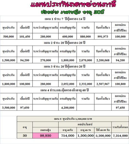 ตัวอย่าง เพศหญิงอายุ 30ปี ทุนประกัน 1,300,000บาท ชำระเบี้ยประกันปีละ 98,930บาทชำระเบี้ย 29ปี