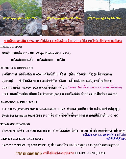 ขายแร่เหล็ก 62% UP (ไม่ต้องวางมัดจำ) (รับ L/C) (เปิด PB ให้) (มีประทานบัตร ใบอนุญาตครบถูกต้อง)!!!!!!