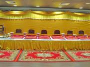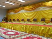 ยกพื้นปูพรม สูง 50 ซม กว้าง 150 ซม ยาว 9.60 ม ผ้าระบายจับจีบสีทอง อาสนะพระสงฆ์มีพนักพิงปูพรม 9 ชุด