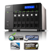 5 x 2.5/ 3.5" SATA Up to 10TB, Hot-swappable, Intel® Atom™ Dual-core Processor, 1GB DDRII RAM, 2 x Gigabit RJ-45 Ethernet port, 5 x USB 2.0 port (Front: 1; Back: 4) Support USB printer, pen drive, USB hub, and USB UPS etc., 2 x eSATA port (Back)