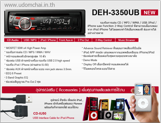 NEW 2011 Pioneer DEH-3350UB รองรับการเล่น CD/MP3/USB/iPod/iPhone/iPad/WMA/WAV/ช่องต่อ AUX-in ด้านหลังเครื่อง ติดตั้งได้มาตรฐานต้องเรา ตัวเครื่องประกันศูนย์ Pioneer-Thailand ครับ