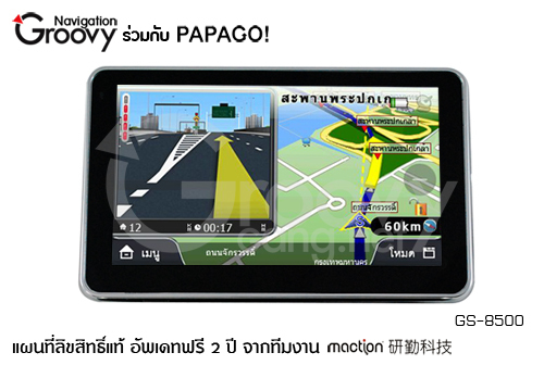 Groovy GPS 5 นิ้ว GS-8500 พร้อมแผนที่ลิขสิทธิ์ใหม่สุดจาก PaPaGO X6 อัพเดทฟรี 2 ปี พร้อมทีมงาน Support คนไทย มี Call center ให้คำปรึกษา มี Junction View, เสียงบอกชื่อถนนทุกแยก, ตึก 3 มิติ สวยงาม ง่ายต่อการใช้งาน อุปกรณ์ครบเครื่อง พร้อมใช้งานเที่ยวทั่วไทย