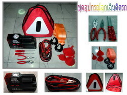ชุดฉุกเฉินติดรถยนต์ประกอบด้วยสายลากรถ สายพ่วงแบตปั๊มลมเครื่องสูบลมกรวยเติมน้ำมันกระเป๋าพร้อมสัญลักษณ์ฉุกเฉิน ชุดคีมและอุปกรณ์ใช้ติดรถยามฉุกเฉิน