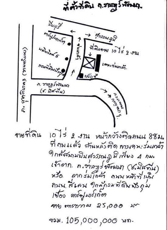 ขายที่ดิน ถ.ราษฎร์พัฒนา หน้ากว้างติดถนน 88 ม. ที่ถมแล้ว ด้านหลังติดการเคหะร่มเกล้า ใกล้สนามบินสุวรรณภูมิเพียง 4 กม. เข้าจากถ.ราษฎร์พัฒนา (ซ.มีสทีน) หรือจากร่มเกล้า ถนนหน้าที่ดินเป็นถนนสี่เลน