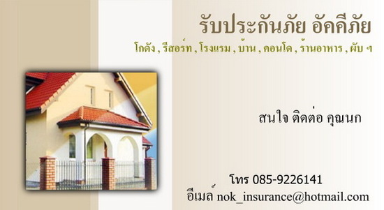 ขโมยทรัพย์สินในบ้าน น้ำรั่ว รถชน พายุถล่ม แผ่นดินไหว มากมายจากการทำประกันภัยบ้านในปัจจุบันนั้นมิได้ ยุ้งยากเหมื่อนอดีตที่ผ่านๆ มา บ้านไม้ทั้งหลัง ตึกแถว คอนโด โกดังสินค้า ผับ เทค ร้านอาหาร บ้านเช่า ท่านเองสามารถจัดสรรค์ความเสี่ยงได้เอง หากบ้านของท่านติดผ่อน ธนาคารก็สามารถซื้อภัยเพิ่มได้ ที่ทางแบ็งทำไว้ให้นั้นไม่ คุ้มครองในหลายๆข้อครับ ยิ่งในปัจจุบันนี้ค่าเบี้ย ถูกมากเนื่องจากการแข็งขันของบริษัทประกันภัยหลายที่ แข่งขันกันมากขึ้น อันเป็นเหตุให้ค่าเบี้ยถูกลงและส่งผลให้ผู้เอาประกันภัยมี ทางเลื่อก เงื่อนไขที่ 085-9226141 นกค๊ะ