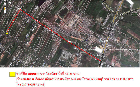 เข้าซอย 400 ม. ติดคลองพิมลราช ต.บางบัวทอง อ.บางบัวทอง จ.นนทบุรี ขาย ตรว.ละ 11000 บาท