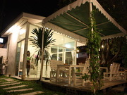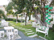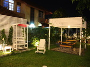ส่วนร้านอาหาร มีพื้นที่กว้างขวาง ตกแต่งแบบสวนสวยมีโต๊ะอาหารพร้อมเก้าอี้ มีเรือนกลางสวน และ ห้องแอร์กลางสวน