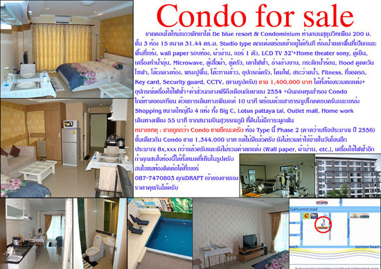 ขายด่วน Condo ใหม่ราคาถูกกว่าโครงการอยู่แถวพัทยาใต้ DE BLUE RESORT & CONDOMINIUM ห่างถนนสุขุมวิทเพียง 200 ม. ชั้น 3 ห้อง 15 ขนาด 31.44 ตร.ม. Studio type ตกแต่งพร้อมเข้าอยู่ได้ทันที ห้องน้ำแยกพื้นที่เปียกและแห้ง, Wall paper รอบห้อง, ผ้าม่าน, แอร์ 1 ตัว, LCD TV 32” + Home Theater sony, ตู้เย็น, เครื่องทำน้ำอุ่น, Microwave, ตู้เสื้อผ้า, ตู้ครัว, เตาไฟฟ้า, อ่างล้างจาน, กระติกน้ำร้อน, Hood ดูดควัน, โซฟา, โต๊ะกลางห้อง, พรมปูพื้น, โต๊ะทานข้าว, อุปกรณ์ครัว, โคมไฟ, สระว่ายน้ำ, Fitness, ที่จอดรถ, Key card, Security guard, CCTV (ตามรูปครับ) ขาย 1,400,000 บาท ได้ทั้งห้องรวมตกแต่ง+เครื่องใช้ไฟฟ้า+ค่าส่วนกลางฟรีถึงเดือนกันยายน+เงินกองทุนสำรอง(เพราะว่าจ่ายไปแล้ว) Condo ใกล้ตัวหาดจอมเทียน ด้วยการเดินทางเพียงแค่ 10 นาที เงียบสงบ แต่ปลอดภัย ใกล้แหล่ง Shopping ขนาดใหญ่ถึง 4 แห่ง ทั้ง Big C, Lotus pattaya tai, Outlet mall, Home work, และด้วยการเดินทางเพียง 55 นาที จากสนามบินสุวรรณภูมิ, ที่ดินไม่มีภาระผูกพัน