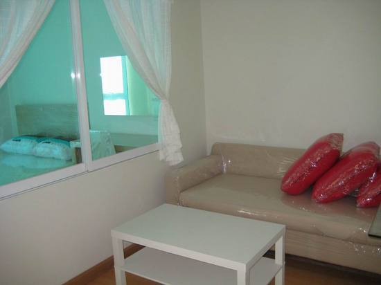 ห้องนั่งเล่น/รับแขก ดูกว้างขวาง มีแอร์อีก 1 ตัวโซฟา โต๊ะอาหารและเก้าอี้ ชั้นวางทีวี และชั้นวางของ ทีวี LG LCD 26 นิ้ว