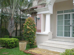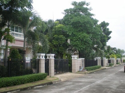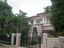บ้านให้เช่า พร้อมเฟอร์นิเจอร์ เครื่องปรับอากาศ 5 เครื่อง เป็นบ้านใหม่ ยังไม่เคยเข้าอยู่ โครงการเงียบสงบ มีสโมสร สระว่ายน้ำ รปภ. 24 ชั่วโมง เข้มงวด ใกล้ แอร์พอร์ทลิ้งค์ วงแหวนตะวันออก มอเตอร์เวย์ สนามบินสุวรรณภูมิ สวนหลวงร.๙ ห้างคาร์ฟูร์ ซีคอนสแควร์ เช่าถูกเดือนละ 6,000 บาท มี 2 หลังติดกัน