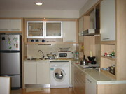 เตียง built-in ตู้เสื้อผ้า ครัว เครื่องใช้ไฟฟ้า มี เครื่องทำน้ำอุ่น เครื่องซักผ้า เตาไฟฟ้า ตู้เย็น เรียกว่าครบหิ้วกระเป๋าอยู่ได้เลย พื้นปูกระเบื้องแกรตนิตโต้