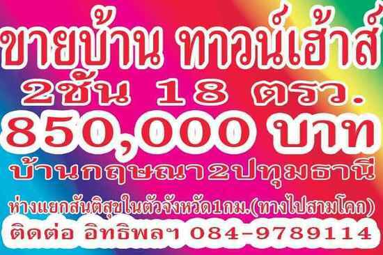 ขายบ้านทาวน์เฮ้าส์สองชั้น สิบแปดตรว. แปดแสนห้า ใกล้ตัวเมืองปทุม หมู่บ้านกฤษณาสอง ห่างแยกสันติสุข หนึ่งกม.
