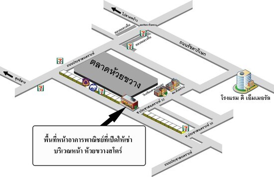ให้เช่าพื้นที่ว่างหน้าอาคารพาณิชย์ ในย่านการค้า และตลาด ติดถนน อยู่ใจกลางเคหะชุมชนห้วยขวาง มีผู้คนสัญจรมากมาย เปิดให้เช่าพื้นที่ว่างด้านหน้าอาคารพาณิชย์ เพื่อทำการค้า มีทั้งแบบรายวัน เพียงวันละ 250 บาท และแบบรายเดือน เพียงเดือนละ 6,000 บาท เท่านั้น