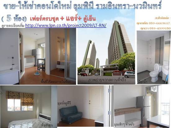 ขาย/ ให้เช่าคอนโดลุมพินี รามอินทรากม.8 (สภาพใหม่) จำนวน 5 ยูนิต มีเส้นทางเข้าออกหลัก 2 เส้นทาง อยู่ในทำเลดี ใกล้รพ. ช็อปปิ้งมอลล์ ทางด่วน ตกแต่งพร้อมเข้าอยู่ มีเฟอร์นิเจอร์ครบชุด + แอร์+ ตู้เย็น ค่าเช่า 5,500 บาท/เดือน *ขาย 1,200,000 บาท ต้องการทราบรายละเอียดของโครงการเพิ่มเติม คลิกไปที่ www.lpn.co.th/project2009/LT-RN/