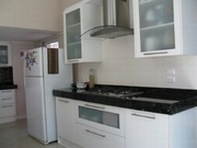ห้องครัว built-in แบบโมเดิร์น เคาน์เตอร์หินอ่อนยาวทรงยู มีตู้เก็บของบนล่าง ออกแบบอย่างลงตัว