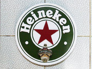 รูปที่ 6 แป้นไม้กลม ขนาด 30 cm ติดที่เปิดขวด Heineken สีเงิน ติดอักษรไม้ฉลุ สีขาว ดาวฉลุสีแดง บนพื้นสีเขียว ขอบวงกลมขาว