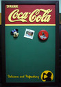 รูปที่ 1 กระดานเขียวแม่เหล็ก แบบแขวน Coca-Cola ลายเด็กดื่มโค้ก ขอบไม้ทาสีน้ำตาลเข้ม ด้านบนติดอักษรไม้ฉลุสีครีม ด้านล่างเพ้นท์รูปเงาเด็กดื่มโค้ก ขนาด 40 cm x 60 cm