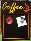 รูปที่ 3 กระดานดำแม่เหล็ก Coffee ขอบนอกสีน้ำตาลเข้ม ตัวอักษรฉลุสีเหลือง + ถ้วยกาแฟฉลุ + คิ้วไม้สีน้ำส้ม ขนาด 30 cm x 40 cm