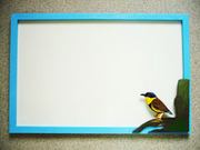รูปที่ 5 กระดานไวท์บอร์ดแม่เหล็ก ขอบไม้ทาสีฟ้า ติดไม้ฉลุเพ้นท์สีรูปนกแต้วแล้วท้องดำ ขนาด 40 cm x 60 cm ใช้เขียนด้วยปากกาไวท์บอร์ดและติดแม่เหล็กได้