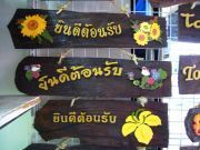 รูปที่ 6 ป้ายไม้ธรรมชาติ ยินดีต้อนรับ 3 แบบ ตัวอักษรไม้ฉลุ + รูปนก หรือดอกไม้ฉลุ เพ้นท์สี