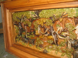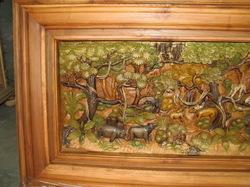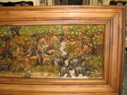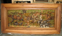 ไม้สักแกะสลักเป็นรูปสัตว์ในป่าแกะสลักจากไม้สักแผ่นเดียวใส่กรอบไม้สักอย่างดี ขนาด 50X110 ซม. หนา 13 ซม.