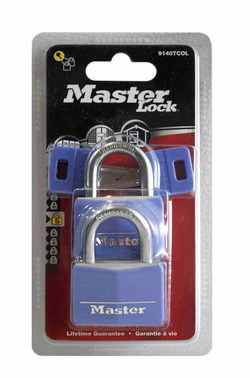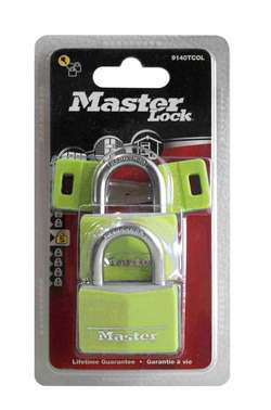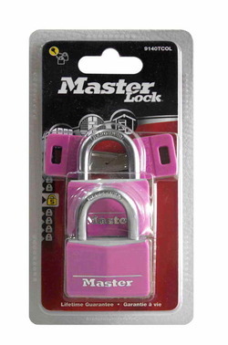ชุดกุญแจคีย์อะไลค์ (key-aliked) มีแม่กุญแจ 2 ตัว/ชุด รุ่น 9140TCOL ตัวกุญแจทำจากอลูมิเนียมหุ้มไวนิลเพื่อกันการขีดข่วน ห่วงกุญแจทำจากเหล็ก และแม่กุญแจมีสีเดียวกับที่ครอบลูกกุญแจ มีให้เลือก 4 สี ; ชมพู, ฟ้า, เขียว, ม่วง ฐานกุญแจขนาด 40 มม.