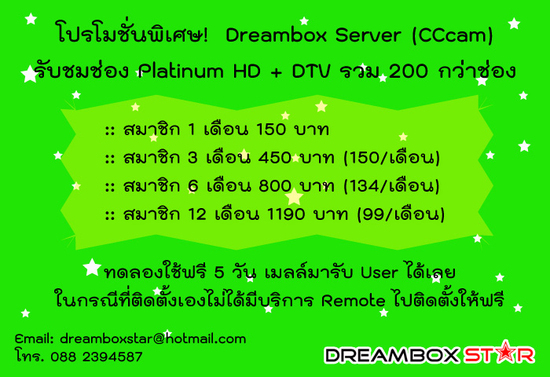 Dreambox Server Platinum HD + DTV รวม 200 กว่าช่อง 150 บาท / แจก User สำหรับทดสอบ ฟรี 5 วัน เมลล์มารับได้เลย บริการ Remote ไปติดตั้งให้ฟรี / ของถูกและดีมีที่นี่ ... ท้าให้ลอง